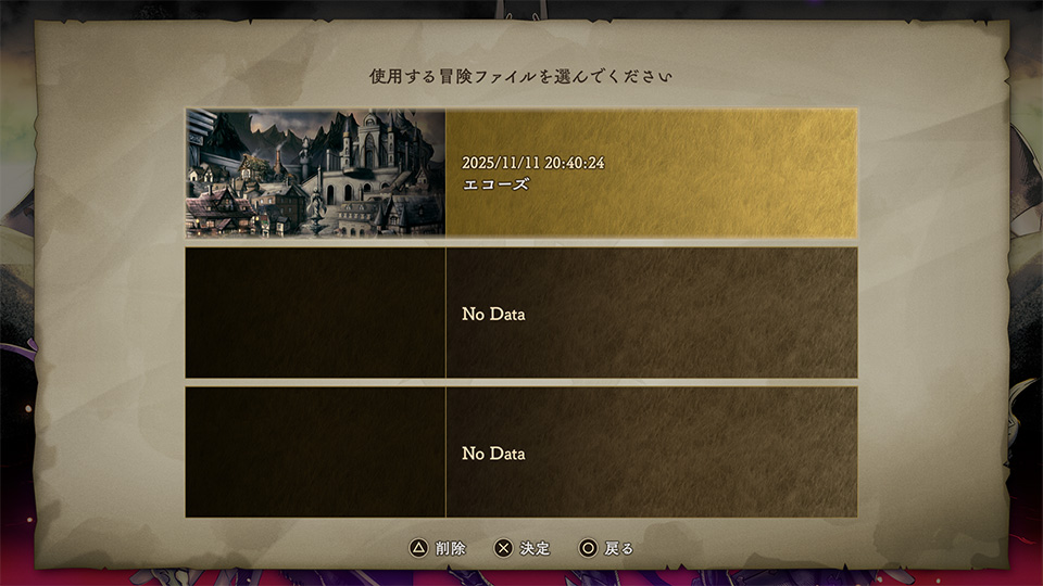 ※セーブにはシステムデータに7.35MB、プレイデータ1スロットあたりに7.35MBMB以上の空き容量が必要です。タイトル画面で「はじめる」を選択した後、ロードしたい冒険ファイルを選択してください。