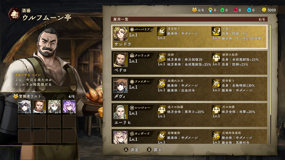 酒場「ウルフムーン亭」では、冒険者を雇い入れることができます。