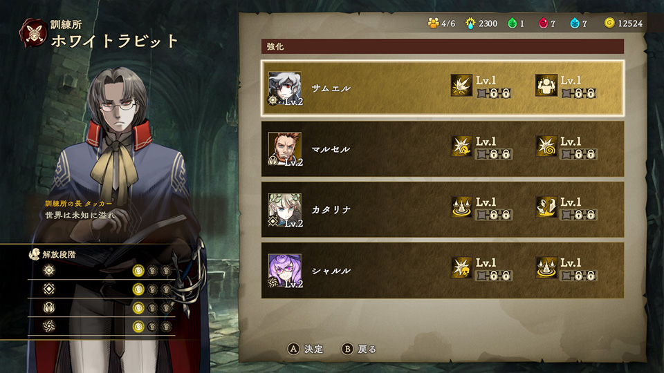 訓練所「ホワイトラビット」では、冒険者のスキルを強化することができます。