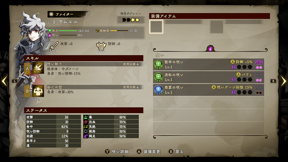 冒険者の詳細からは、冒険者のステータス、固定武器/装備の強化レベル、スキルの強化レベル、受けている呪いの詳細を確認することができます。