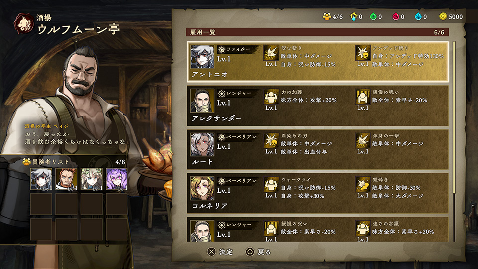 酒場「ウルフムーン亭」では、冒険者を雇い入れることができます。