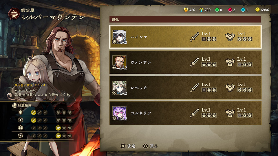 鍛冶屋「シルバーマウンテン」では、冒険者の固定武器/防具を強化することができます。