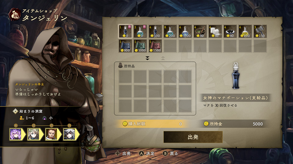 アイテムショップ「タンジェリン」では、ダンジョン探索に持ち込む消費アイテムを購入できます。