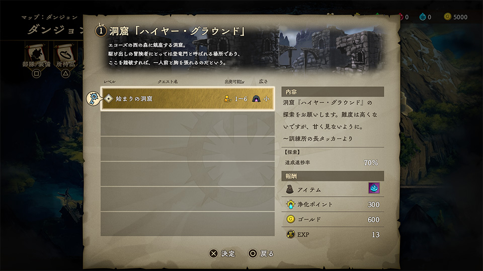 ダンジョンを選択後、探検可能なクエストがリストで表示されます。