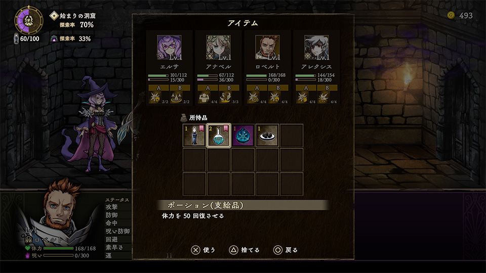 | I | 女神のマナ | ダンジョン内の呪いの瘴気を防いでくれます。移動すると消費します。ゼロになると呪いダメージを受けます。 |