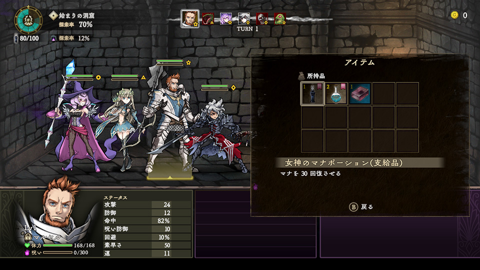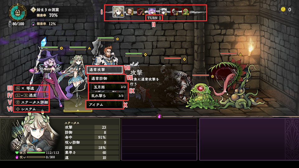 | IV | 逃走 | バトルから逃走します。直前の部屋に戻ります。 |