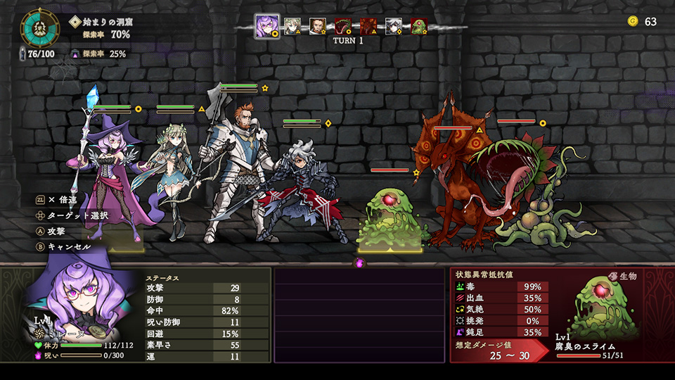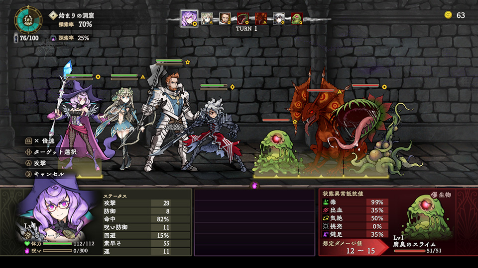 モンスターを攻撃するには、通常攻撃かスキルを選択して対象のモンスターを選択し、ボタンを押下します。