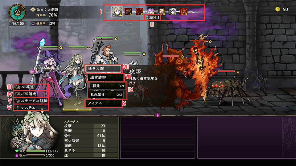 | II | TURN | すべてのキャラクター/モンスターが行動済で、ターンが経過します。 |