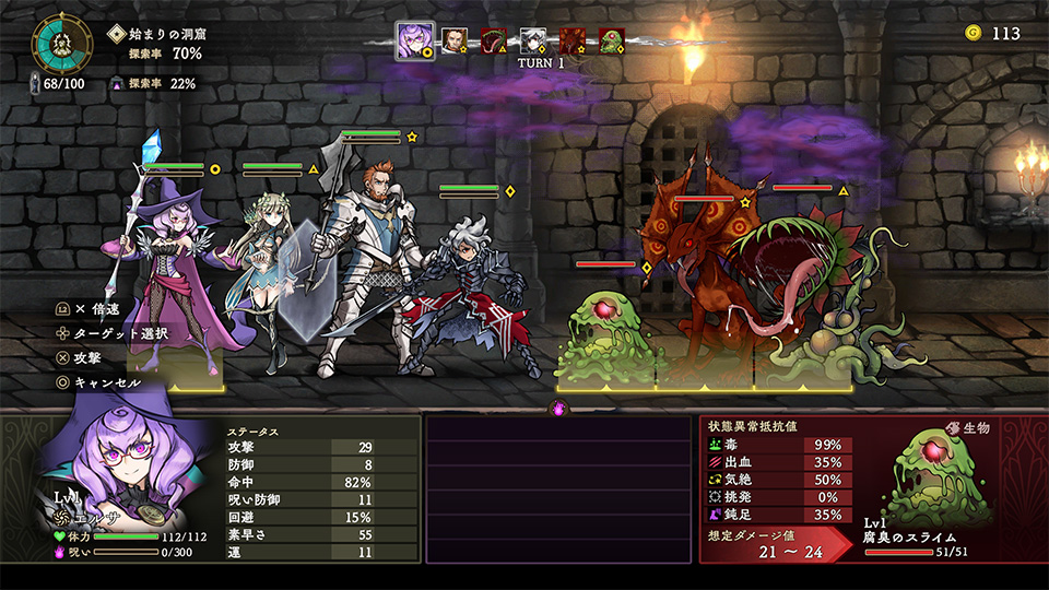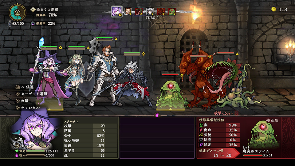 モンスターを攻撃するには、通常攻撃かスキルを選択して対象のモンスターを選択し、ボタンを押下します。