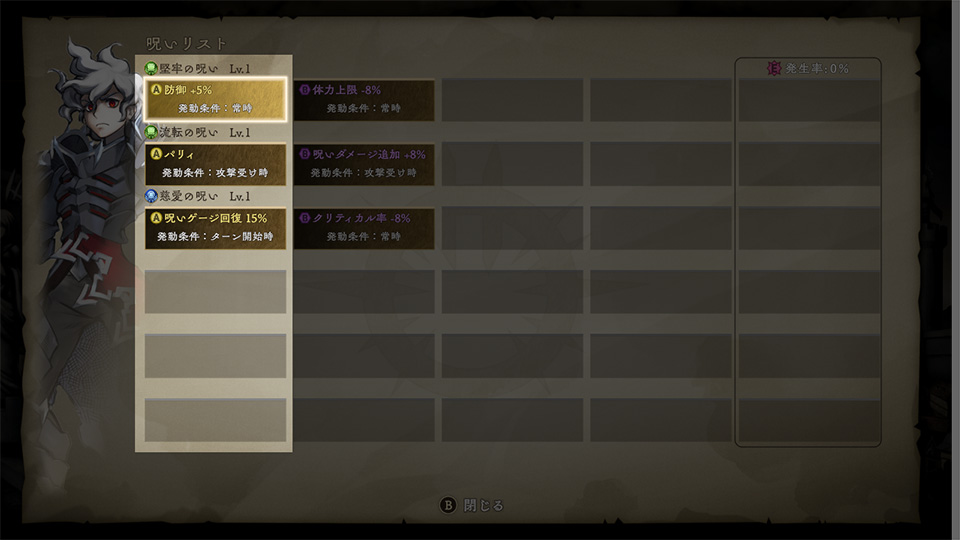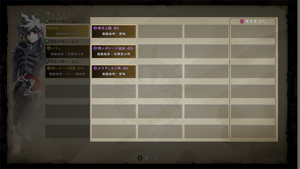 呪いゲージが、100%、200%に達すると、「呪い」を1つランダムで受けることになります。