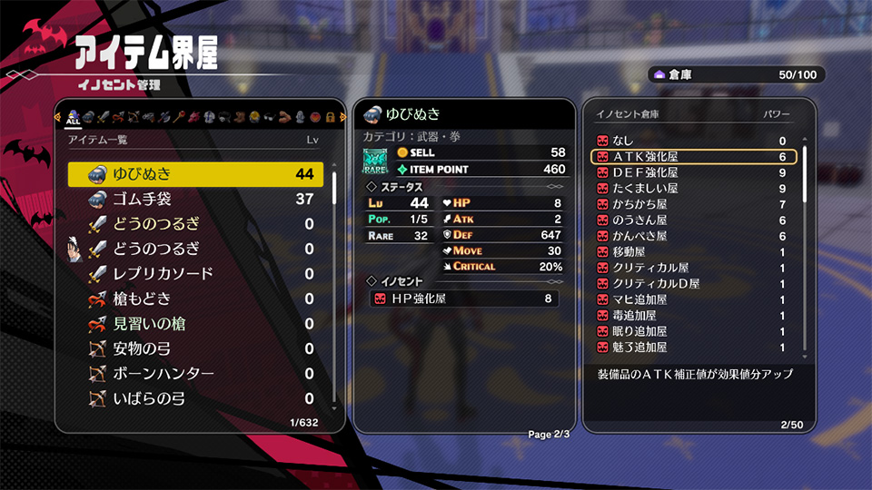 イノセント管理では、アイテムに住むイノセントの移動や合体などの管理が行えます。