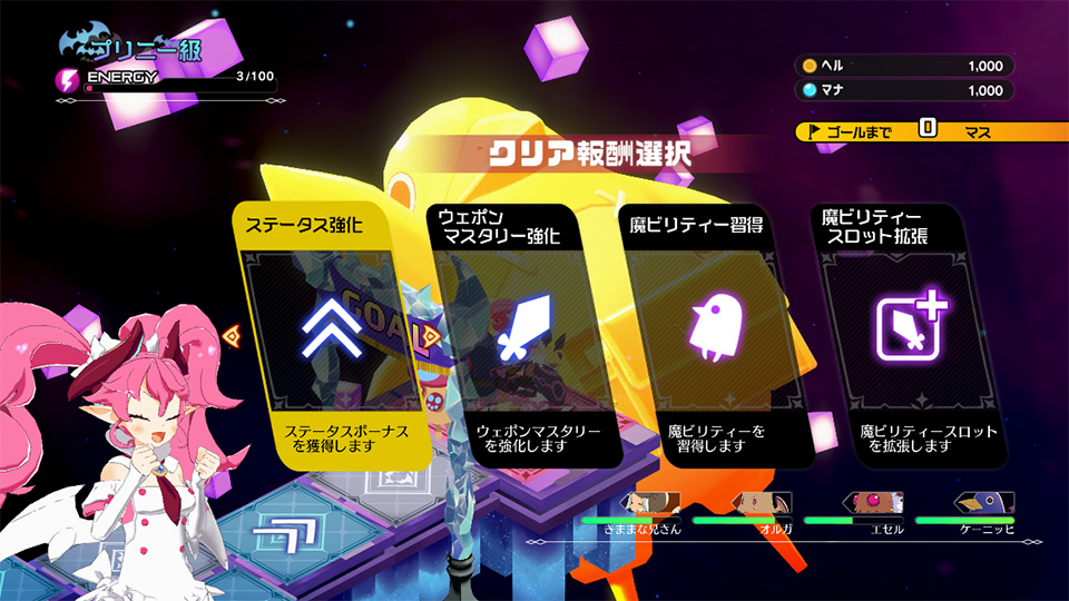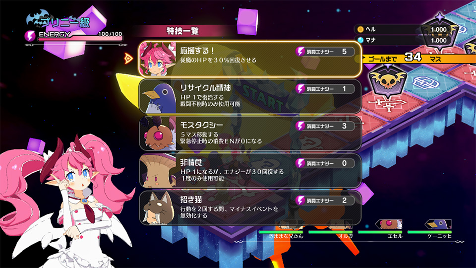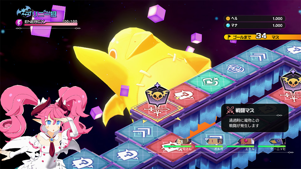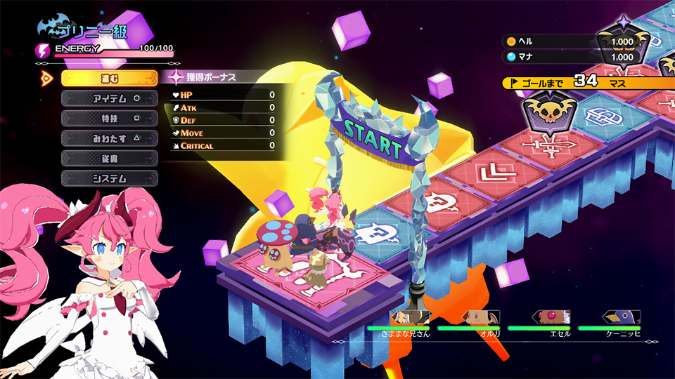 キャラ界は、すごろく風のダンジョンになっており、ティシエルが従魔を引き連れて探索を行うことで、エヌエーの能力を強化できます。