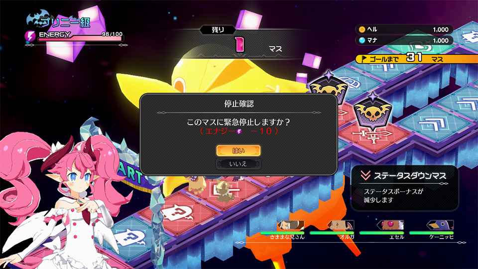 移動中にAボタンを押すと、エナジーを10消費して途中のマスに緊急停止できます。