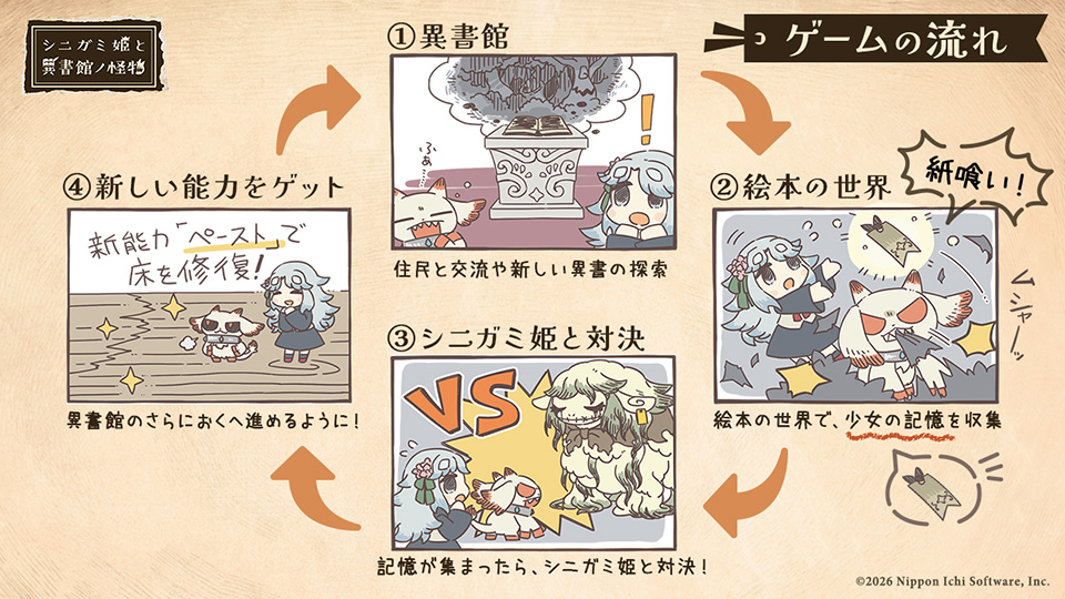 『異書館』に収容された絵本の世界を冒険し、少女の記憶を集めて怪物『シニガミ姫』をヒトの姿に戻してあげましょう。