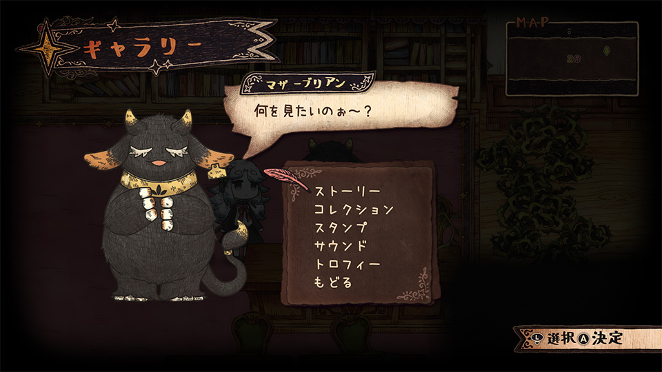 ウシの怪物『マザーブリアン』に話しかけて『ギャラリー』を選択すると、『ギャラリー』を開くことできます。