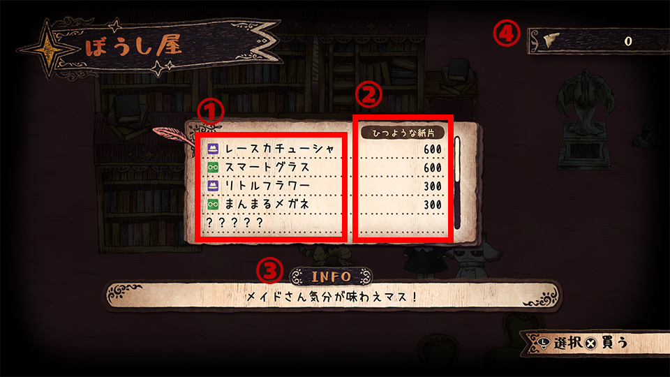 ①買えるもの 買えるものです。(『?????』と表示されているものはまだ買えないもの)