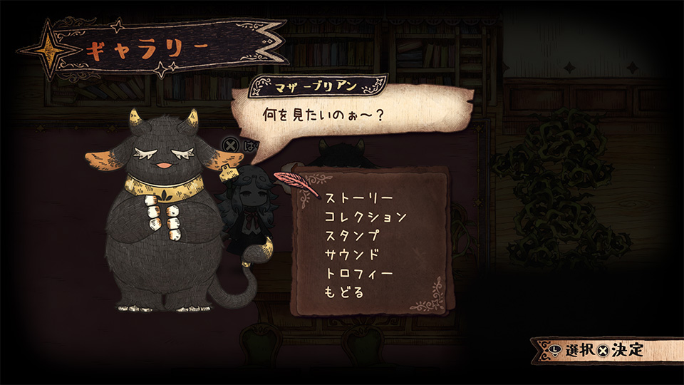 ウシの怪物『マザーブリアン』に話しかけて『ギャラリー』を選択すると、『ギャラリー』を開くことできます。
