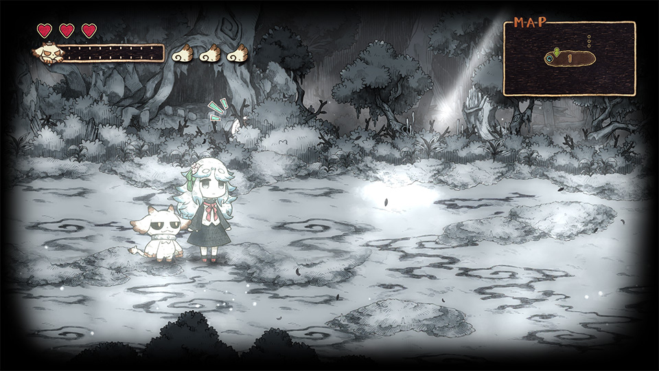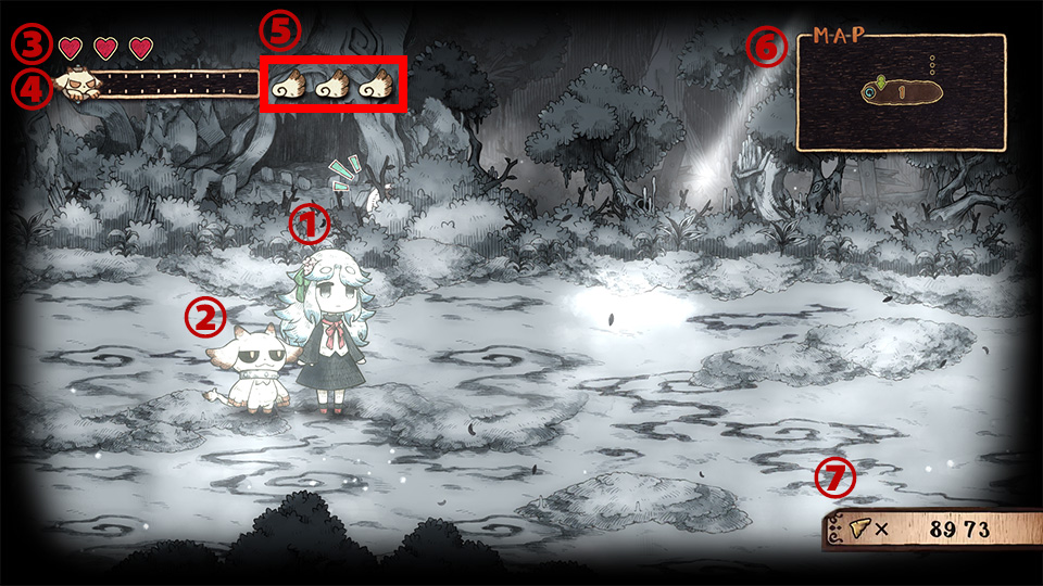 | ②メェル | プレイヤーのあとに付いてくる相棒です。 基本的にモノのあとに付いてきますが、『紙喰い』のカーソルの表示中は、カーソルの元に向かっていきます。 |