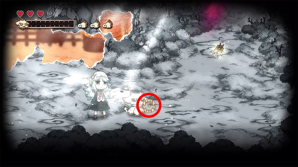 紙喰いカーソルはスティックで操作ができて、カーソルの表示中はメェルがカーソルの元に付いていきます。