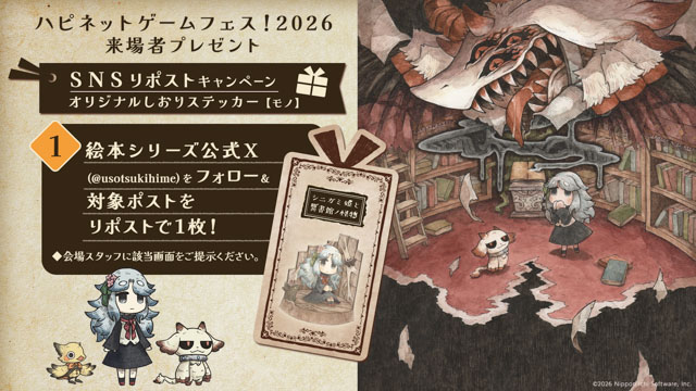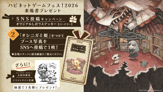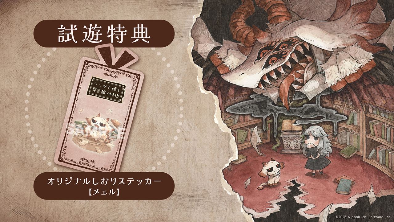 1階アドベンチャーブースにて、2026年4月30日(木)発売予定の絵本シリーズの3作目となるメルヘンをこわすアドベンチャー『シニガミ姫と異書館ノ怪物』の試遊会を開催します。